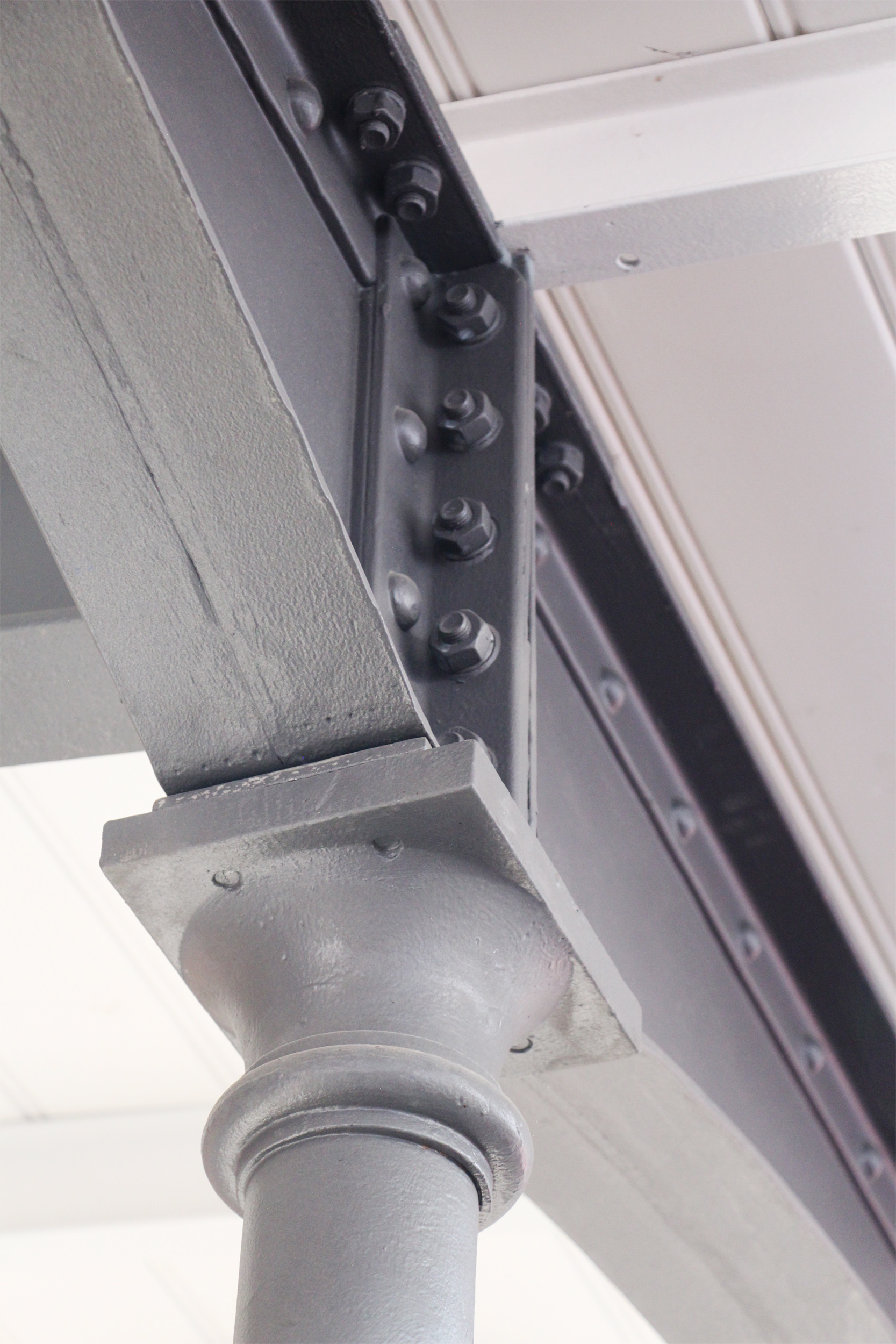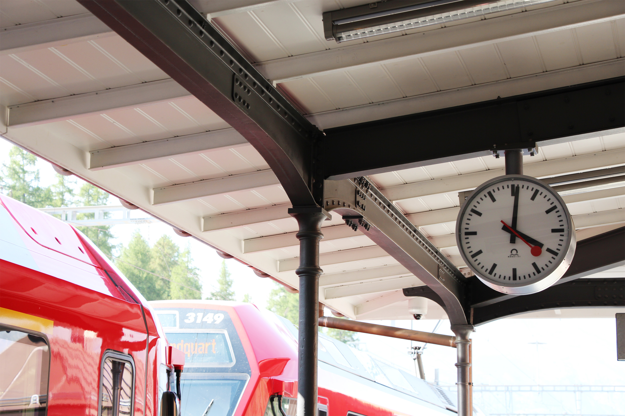 Ein besonderes Augenmerk galt dem filigranen Perrondach aus der Gründerzeit, einer leichten Stahlkonstruktion mit hoher gestalterischer Qualität. Im Rahmen der Instandstellungsarbeiten wurde es vollständig restauriert: Korrosionsschäden wurden behoben, die Tragstruktur ertüchtigt und die ursprüngliche Farbgebung rekonstruiert. Das Dach bildet heute wieder einen eleganten, luftigen Abschluss des Bahnsteigs und vermittelt zwischen technischer Funktionalität und historischer Anmutung.