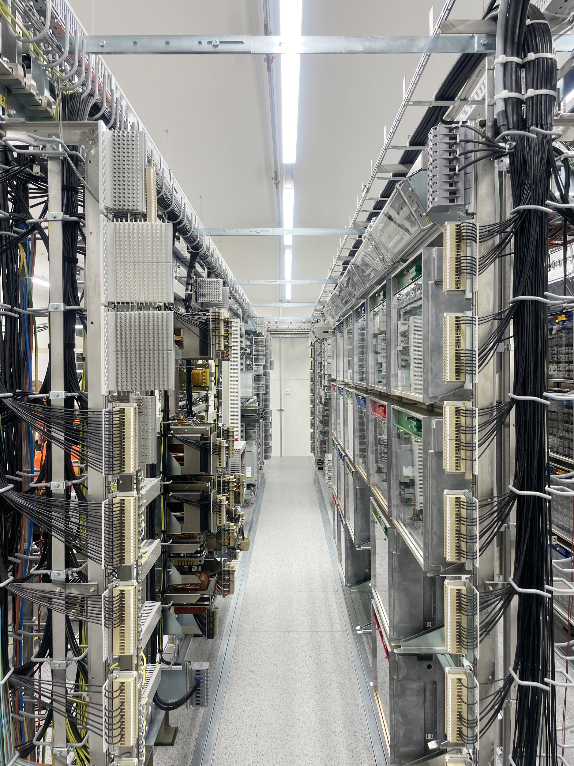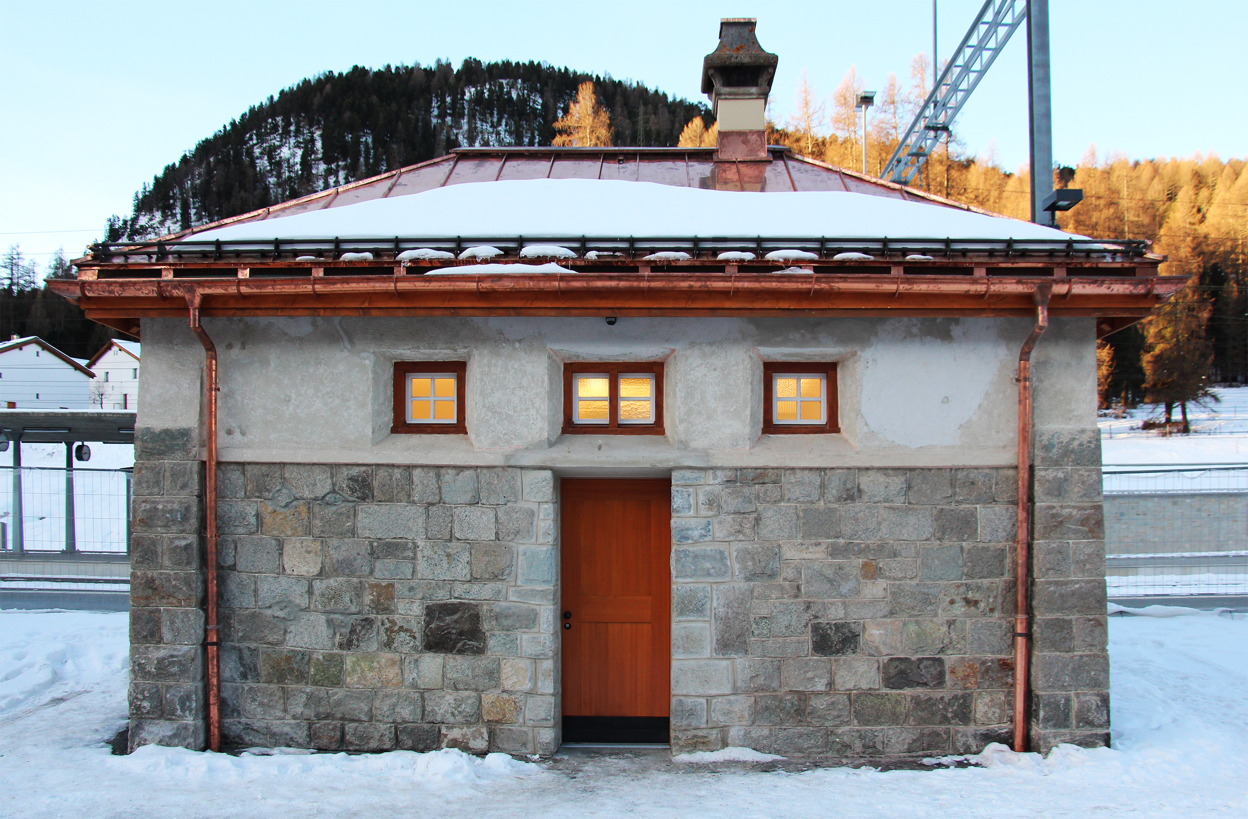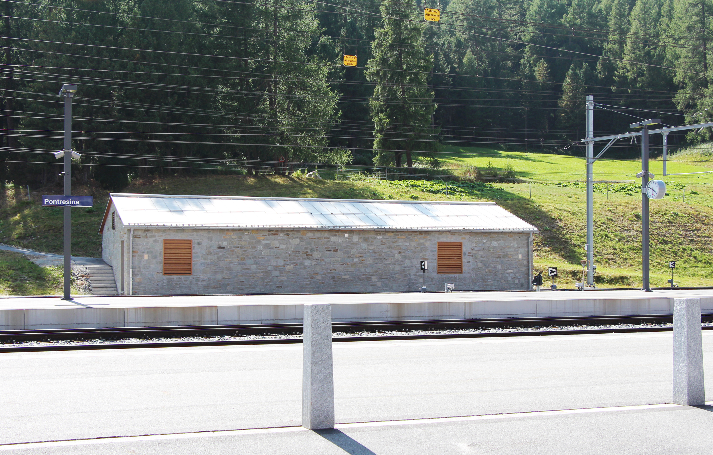 Im Zuge der betrieblichen Modernisierung wurde ein neues Dienstgebäude erforderlich, um die veraltete Stellwerkstechnik zu ersetzen. Der Neubau der Schaltanlage wurde als kompakter Steinbau realisiert, der sich in Materialität und Ausdruck an den typischen Bauformen der Berninalinie orientiert. Die Fassaden aus Naturstein, die präzise gesetzten Öffnungen und die klare Dachgeometrie verleihen dem Gebäude eine ruhige, robuste Präsenz, die sich selbstverständlich in das historische Ensemble einfügt.