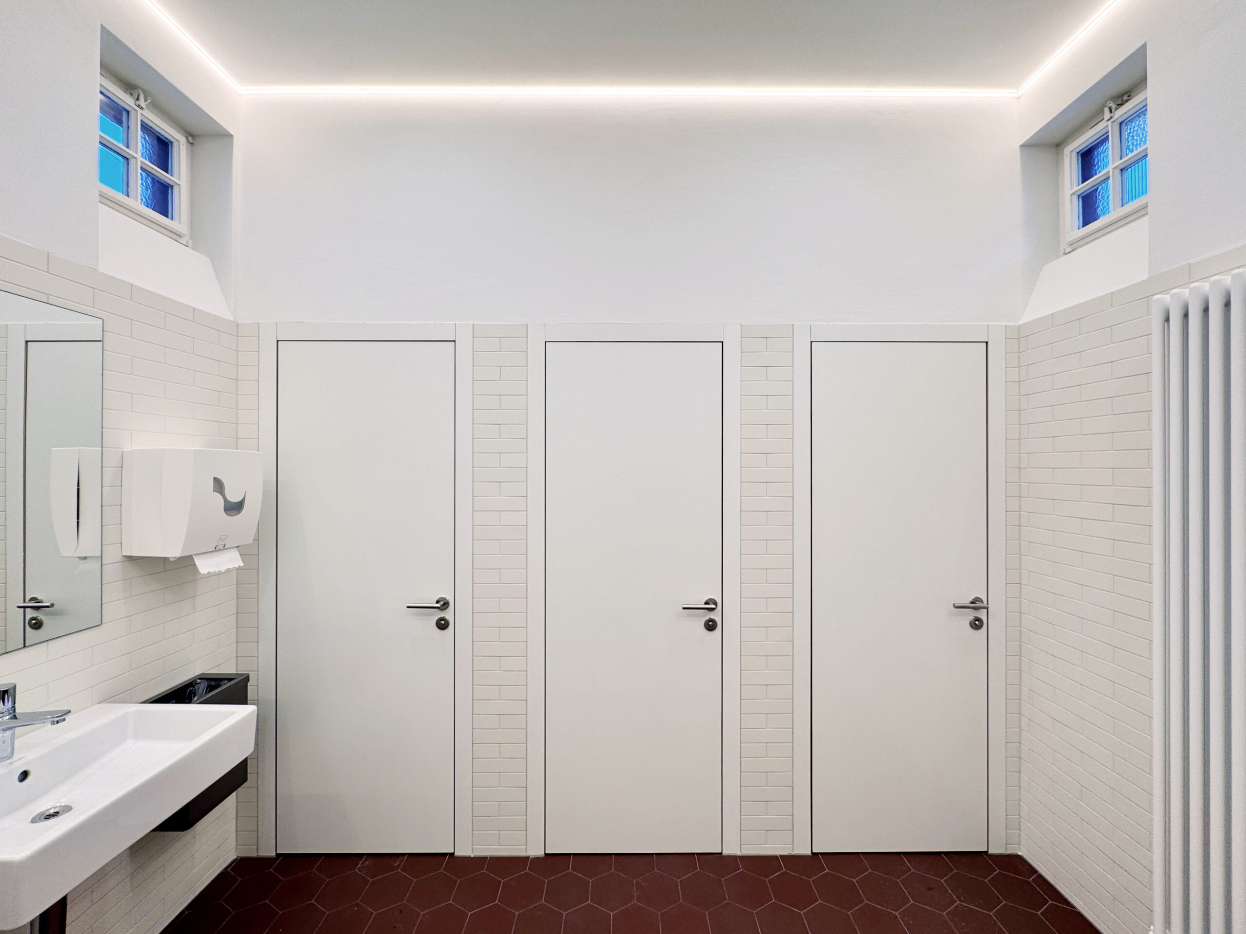 Auch das kleine, aber bedeutende WC-Gebäude wurde umfassend saniert. Die späteren Überformungen und Schichten wurden sorgfältig zurückgebaut, um die ursprüngliche Struktur wieder sichtbar zu machen. Im Inneren wurde die Infrastruktur zeitgemäss erneuert und die räumliche Organisation optimiert, ohne den historischen Charakter des Gebäudes zu beeinträchtigen.