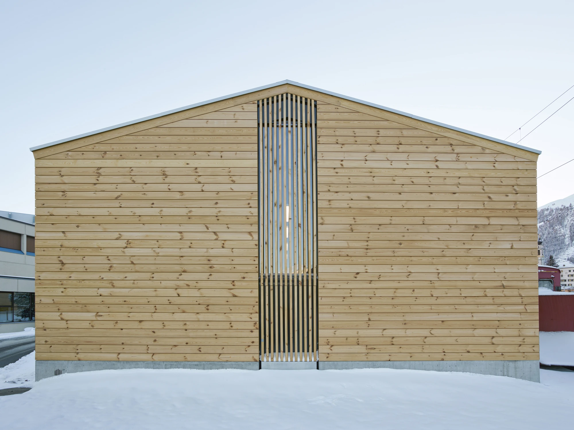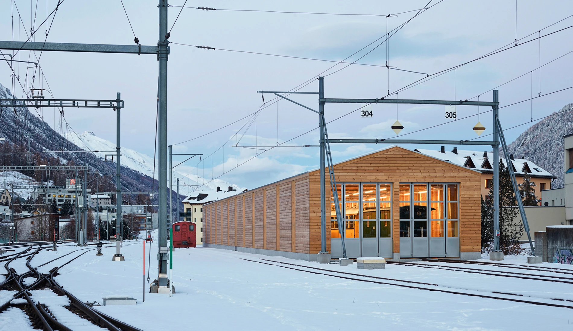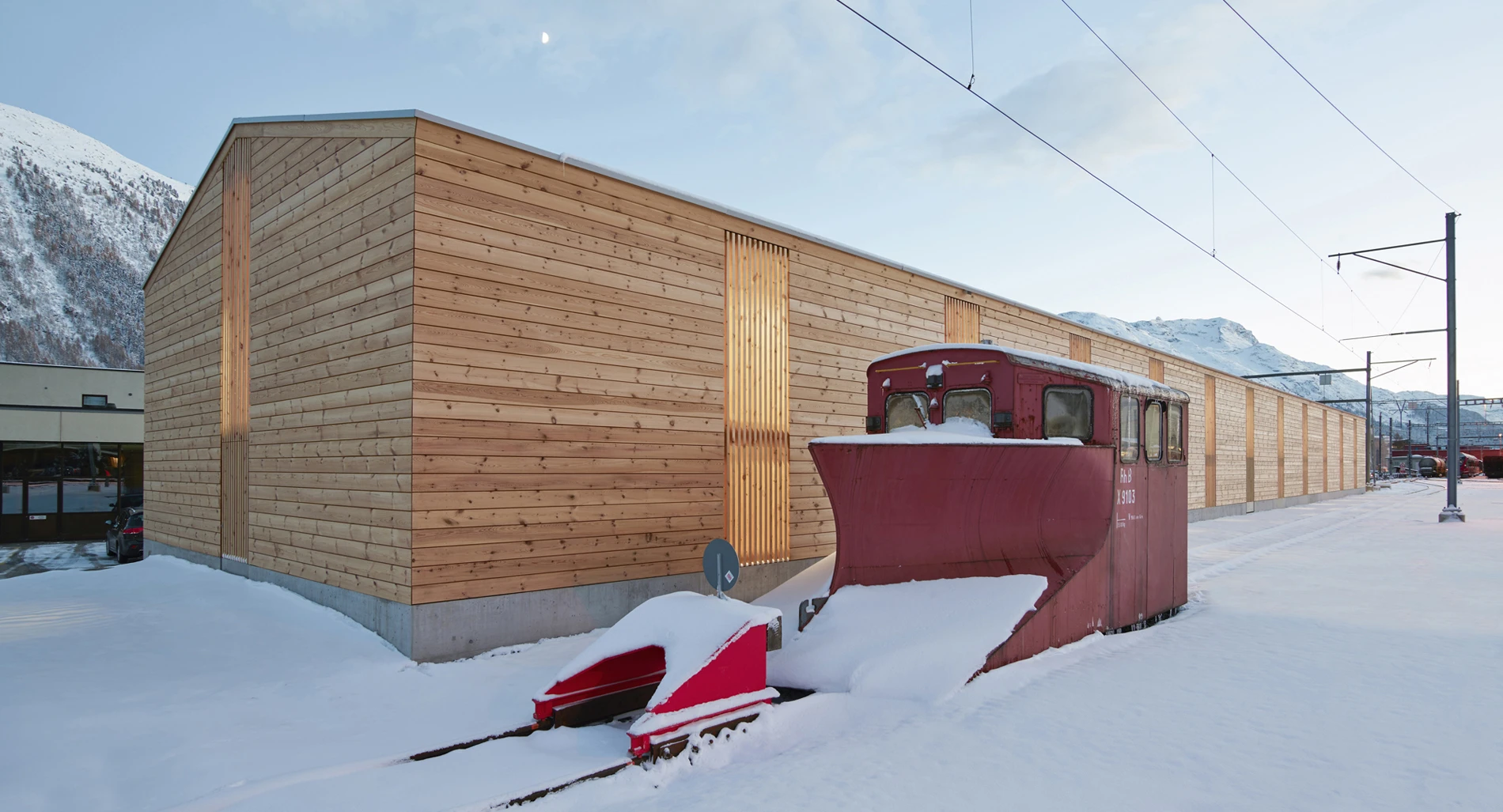 Die Halle überspannt zwei Stumpengeleise am Rande des Bahnhofplateaus. Der massive Sockel, die Föhrenschalung und die Blecheindeckung des Satteldaches übernehmen die architektonischen Prinzipien der schlichten bahntechnischen Neben- und Nutzbauten der RhB. Der vorbetonierte Sockel in Sichtbetonqualität schützt die Fassade vor mechanischer Beschädigung und gibt der darüber liegenden Holzkonstruktion Halt. Durch die gewählte Anordnung der Holzträger aus Fichtenholz bildet sich eine Rhythmisierung der Tragstruktur. Zwischen jeweils zwei Trägern, welche in kurzen Abständen zueinander stehen, ist ein vertikales Fensterelement oder eine Zugangstür angeordnet. Die entstehende Regelmässigkeit ist eine Referenz an historische Bahnhallen entlang der rhätischen Bahnlinie. Das Bahnpublikum hat keinen Zutritt in den Hallenraum, deshalb sollen die Tür- und Fensterelemente möglichst nicht als solche erkannt werden und sind mit feinen Föhrenholzlamellen verkleidet. Die Einstellhalle erhält dadurch ein filigranes Aussehen und lässt den langen Baukörper nach aussen kleiner in Erscheinung treten. Die Dacheindeckung aus Trapezblech übernimmt nebst der Holztragkonstruktion eine aussteifende, statische Funktion.