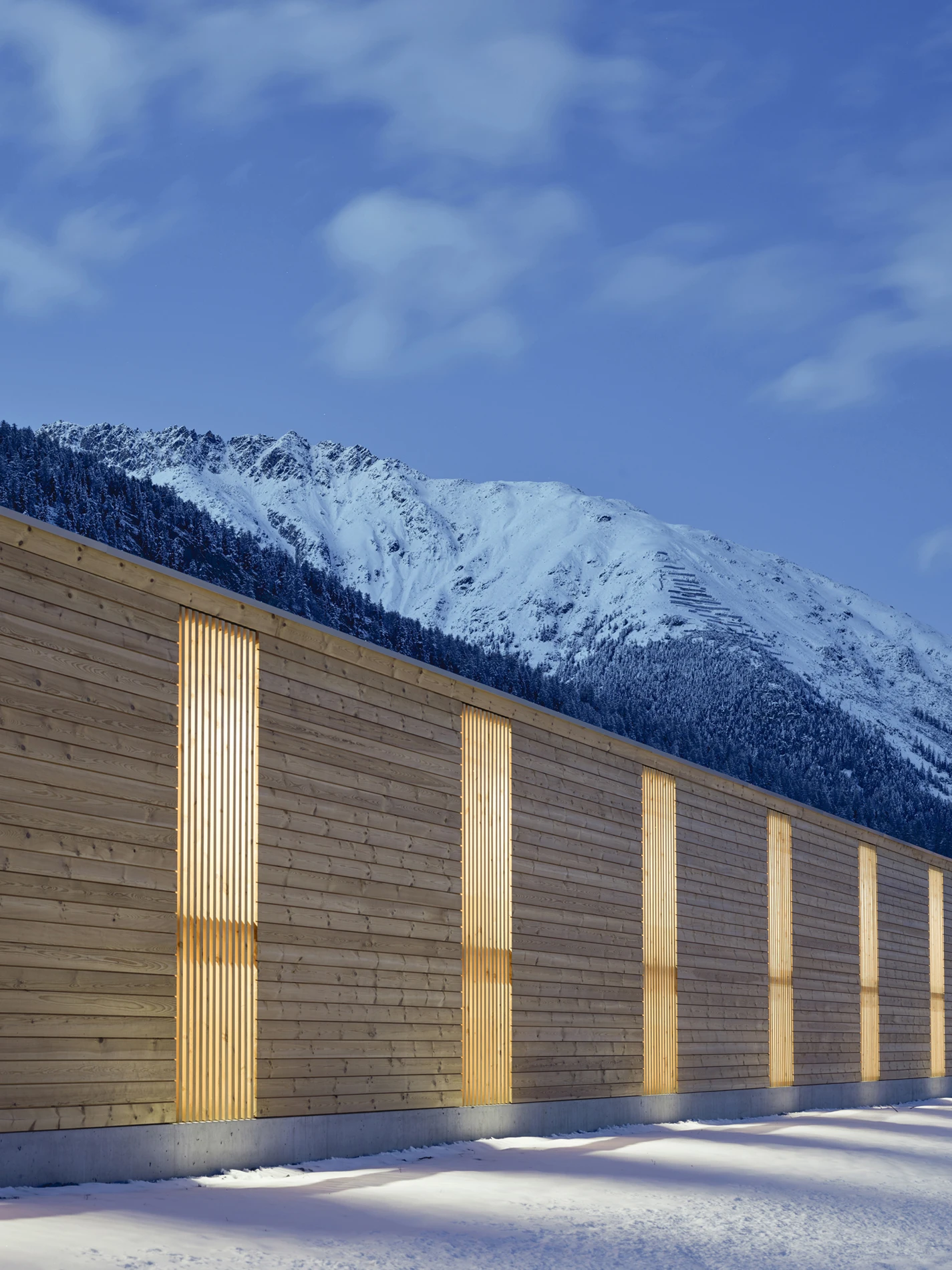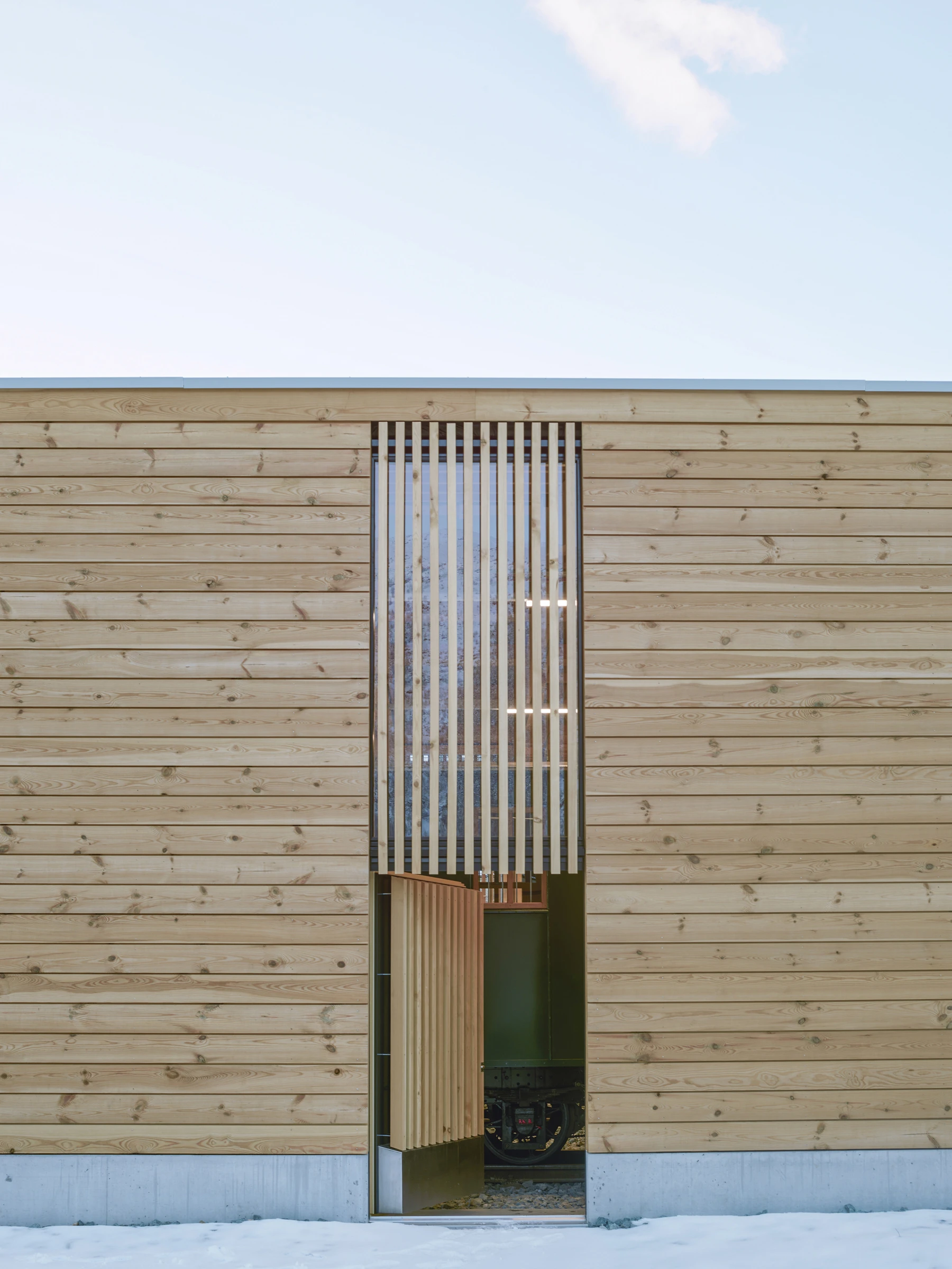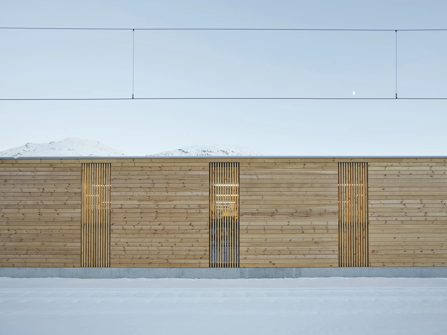 Die Halle überspannt zwei Stumpengeleise am Rande des Bahnhofplateaus. Der massive Sockel, die Föhrenschalung und die Blecheindeckung des Satteldaches übernehmen die architektonischen Prinzipien der schlichten bahntechnischen Neben- und Nutzbauten der RhB. Der vorbetonierte Sockel in Sichtbetonqualität schützt die Fassade vor mechanischer Beschädigung und gibt der darüber liegenden Holzkonstruktion Halt. Durch die gewählte Anordnung der Holzträger aus Fichtenholz bildet sich eine Rhythmisierung der Tragstruktur. Zwischen jeweils zwei Trägern, welche in kurzen Abständen zueinander stehen, ist ein vertikales Fensterelement oder eine Zugangstür angeordnet. Die entstehende Regelmässigkeit ist eine Referenz an historische Bahnhallen entlang der rhätischen Bahnlinie. Das Bahnpublikum hat keinen Zutritt in den Hallenraum, deshalb sollen die Tür- und Fensterelemente möglichst nicht als solche erkannt werden und sind mit feinen Föhrenholzlamellen verkleidet. Die Einstellhalle erhält dadurch ein filigranes Aussehen und lässt den langen Baukörper nach aussen kleiner in Erscheinung treten. Die Dacheindeckung aus Trapezblech übernimmt nebst der Holztragkonstruktion eine aussteifende, statische Funktion.
