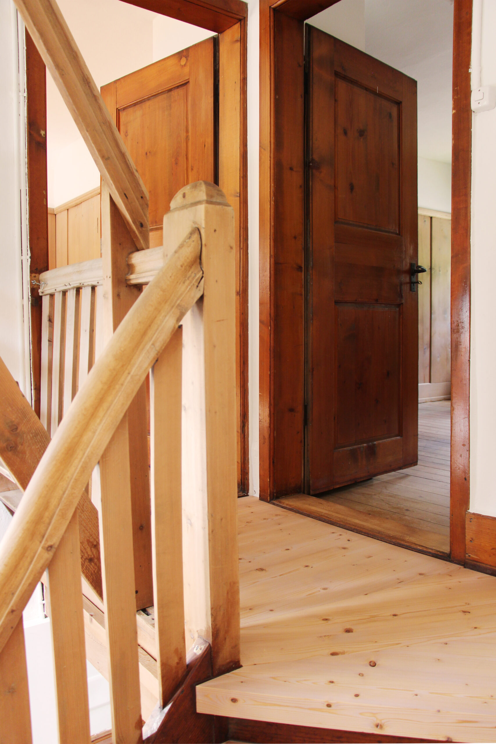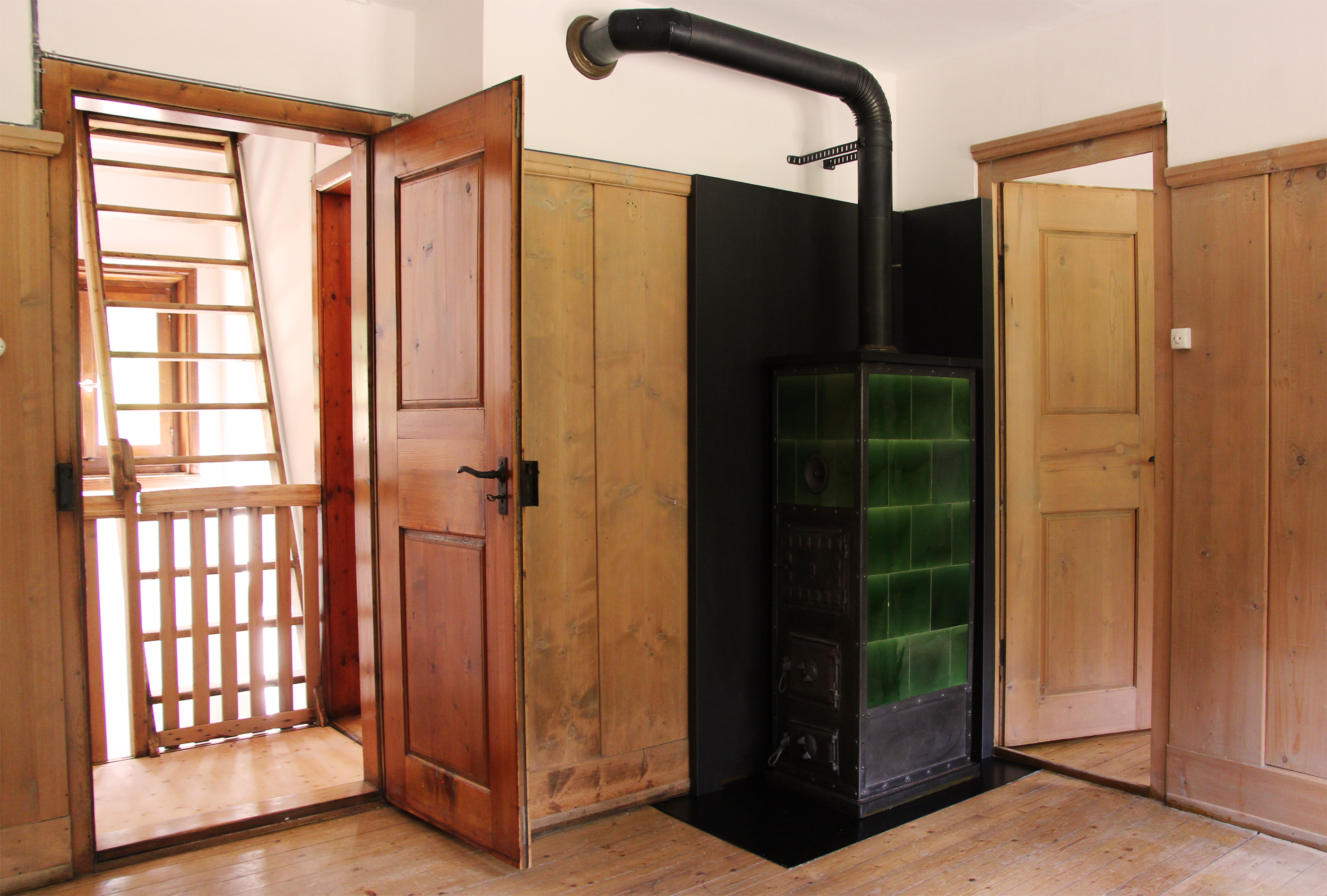 Im Inneren des Bahnwärterhauses wurden ebenfalls behutsame Eingriffe vorgenommen. Der Holzanbau des Wärterhauses wurde um eine neue Nasszelle mit Dusche erweitert. Bislang nutzten die Bewohner den Brunnen im kleinen Hof zwischen dem Hühnerstall und dem Hauptgebäude als Wasserquelle. Die sorgfältige Renovierung der historischen Bauteile im Inneren wurde mit dem Ziel durchgeführt, den ursprünglichen Charakter zu bewadhren und gleichzeitig modernen Komfort zu integrieren. Eine neue Küche wurde ebenfalls eingebaut, was das Haus nun auf den heutigen Wohnstandard anhebt.
